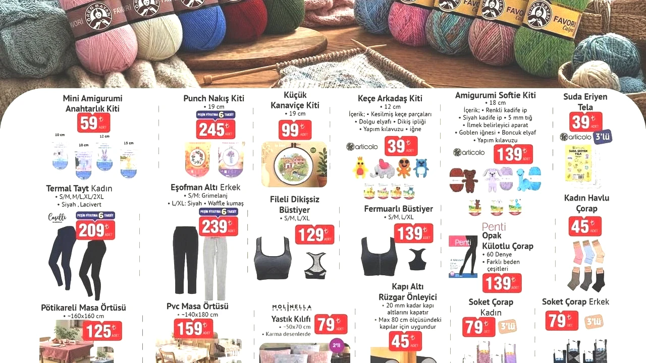 Bu hafta ev tekstil ürünleri, örgü ipleri ve el işi kitleri de raflarda yer almakta. Özellikle hobi ve kendin yap meraklıları için çeşitli setler dikkate değer.